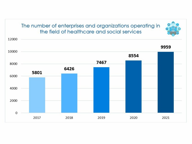 According to the State Committee on Statistics, as of August 1, 2021, the share of enterprises and organizations operating in the field of healthcare and social services in the total number of enterprises and organizations amounted to 1.9 percent (9,959 units).