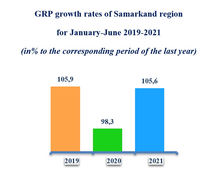 According to the results of January-June 2021, the GRP of the Samarkand region amounted to 21,045.2 billion soums and, compared to the corresponding period of 2020, increased by 5.6%. In this region, positive growth rates were noted in the sectors of agriculture, forestry and fisheries - 100.2% (share in the GRP structure - 36.5%), industry - 108.1% (15.5%), construction - 110.5 % (6.7%) and the service sector - 108.8% (41.3%). GRP per capita increased by 3.7% and amounted to 5,307.6 thousand soums.