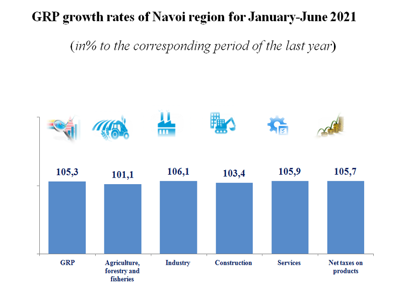 According to the results of January-June 2021, the GRP of the Navoi region increased by 5.3 %. In the GRP structure, the growth rates of agriculture, forestry and fisheries amounted to 101.1 %, industry 106.1 %, construction 103.4 % and services 105.9 %.