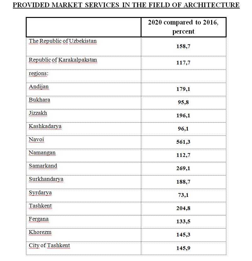 According to the State Committee on Statistics, in 2020 in the Republic of Uzbekistan compared to 2016, the growth rate of the volume of market services in the field of architecture is 158.7%.