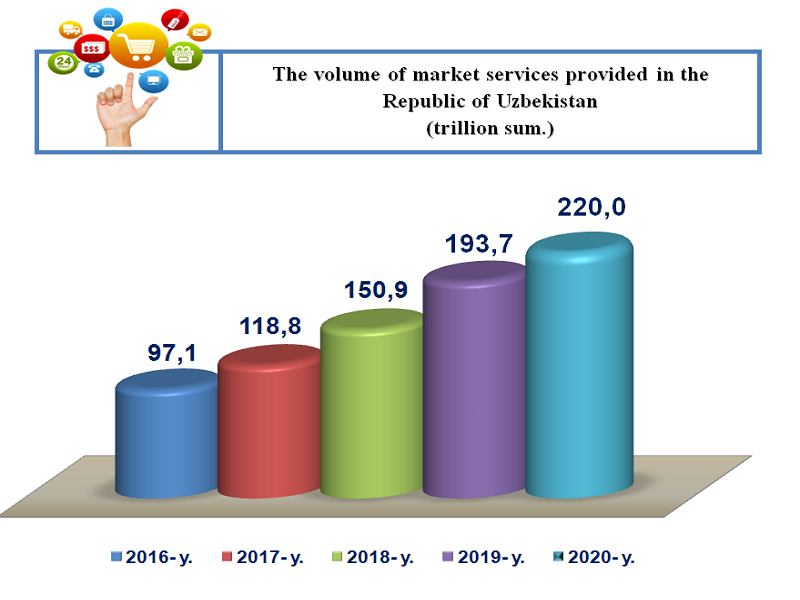 In recent years, a sharp increase in the volume of market services provided has been observed in the Republic of Uzbekistan. If in 2016 the total volume of provided market services amounted to 97.1 trillion. soums, then in 2020 this figure was 220.0 trillion. soums.