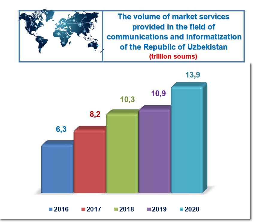 Today the role of the sphere of communications and informatization in the development of the economy of our country is invaluable. The volume of market services provided in this direction, at the end of 2016, amounted to $ 6.3 trillion. sum. As a result of the reforms carried out in the industry by the end of 2020, this figure will amount to 13.9 trillion. Sum.