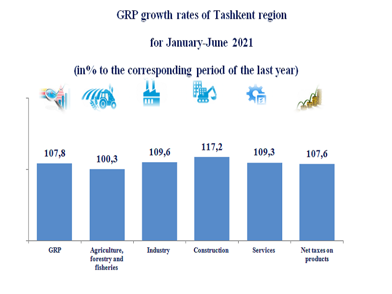 According to the results of January-June 2021, the GRP of the Tashkent region increased by 7.8%. In the structure of GRP, the growth rates of agriculture, forestry and fisheries amounted to 100.3%, industry - 109.6%, construction - 117.2% and services - 109.3%.