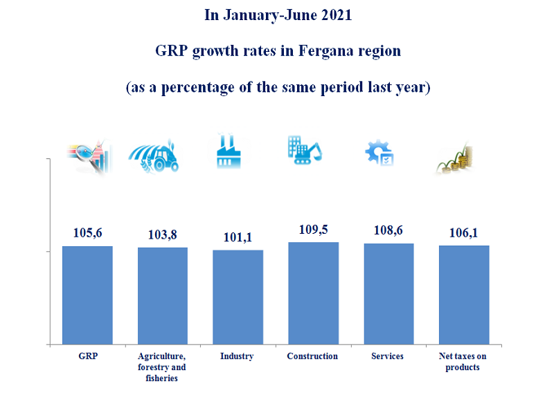According to the results of January-June 2021, the GRP of the Fergana region increased by 5.6%. In the structure of GRP, the growth rates of agriculture, forestry and fisheries amounted to 103.8%, industry - 101.1%, construction - 109.5% and services - 108.6%.