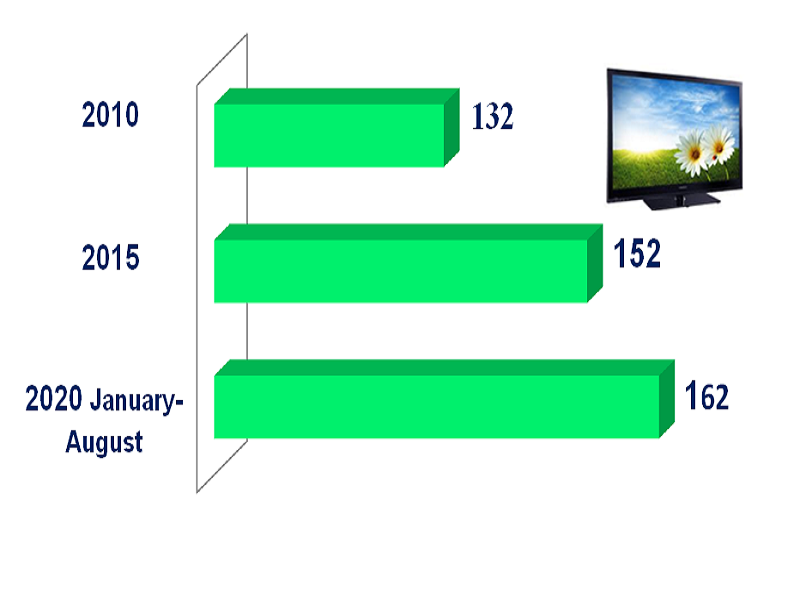 According to the data of sample surveys of households by the State Committee on Statistics, in January-August 2021, the number of televisions per 100 households was 162.