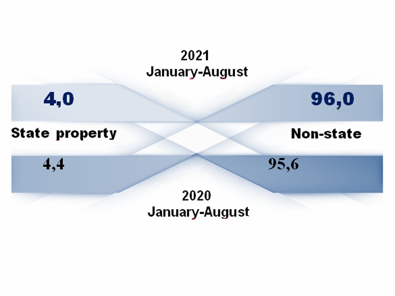 Construction work in the country as a whole, carried out by state organizations, reached 2643.4 billion soums, the volume of construction work performed by non-governmental organizations amounted to 63,769.0 billion soums, and their share is 4.0% and 96.0%, respectively.