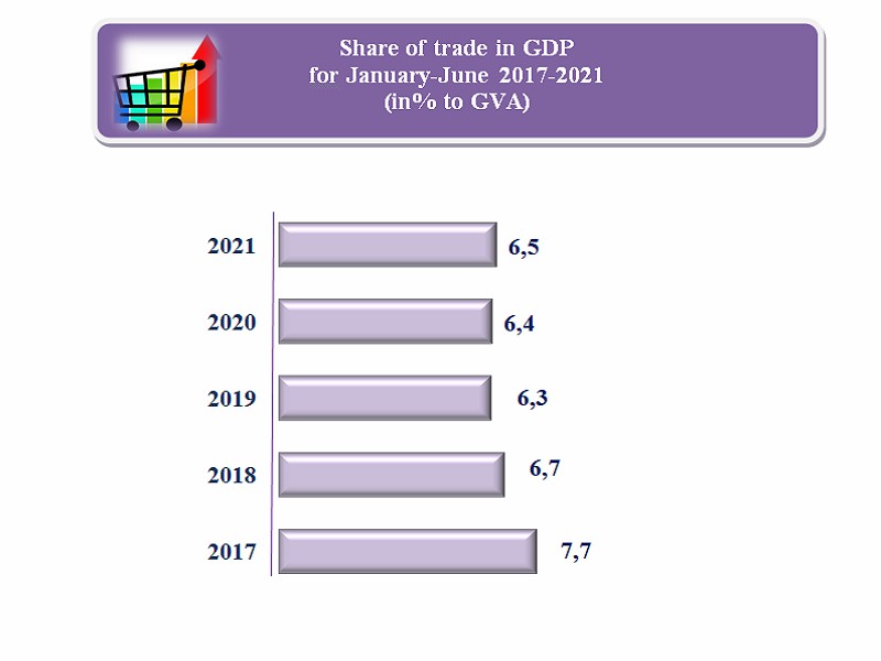 At the end of January - June 2021, the gross value added (GVA) in trade in the Republic of Uzbekistan amounted to 19 303.4 billion soums and, compared to the same period last year, increased by 9.1 %.