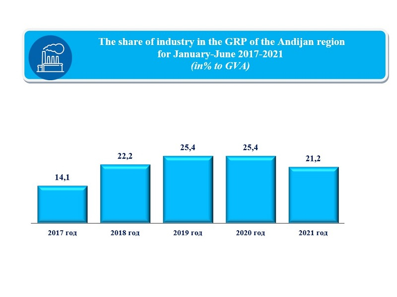 According to the results of January-June 2021, the gross value added (GVA) in industry in the Andijan region amounted to 3 788.0 billion soums and a decrease in volume in comparable prices was noted, which amounted to 93.5% compared to the level of January-June 2020. In the period under review, the share of this sector in the GRP reached 21.2%.