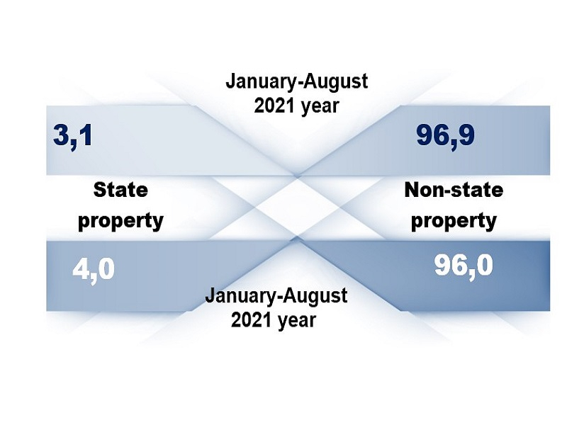 Construction work in the country as a whole, carried out by state organizations, reached 106.2 billion soums, the volume of construction work carried out by non-governmental organizations amounted to 3343.8 billion soums, and their share is 3.1% and 96.6%, respectively.