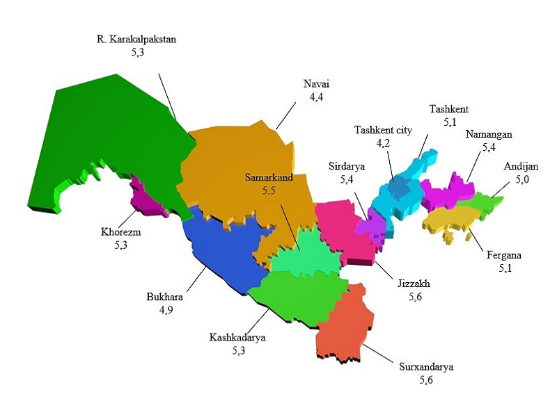 According to the data of sample surveys of households by the State Committee on Statistics, in January-September 2021, the average number of household members was 5.1 people. Analyzing this indicator by region, the highest indicator is observed in Jizzakh and Surkhandarya regions (5.6 people), and the lowest - in the city of Tashkent (4.2 people).