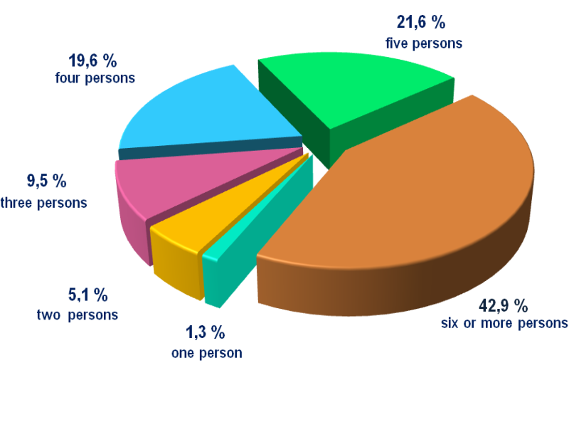 1.3 % of single-person households, 5.1 % of two-person households, 9.5 % of three-person households, 19.6 % of four-person households, 21.6 % of households of five people, and 42.9 % of households consist of six or more people.
