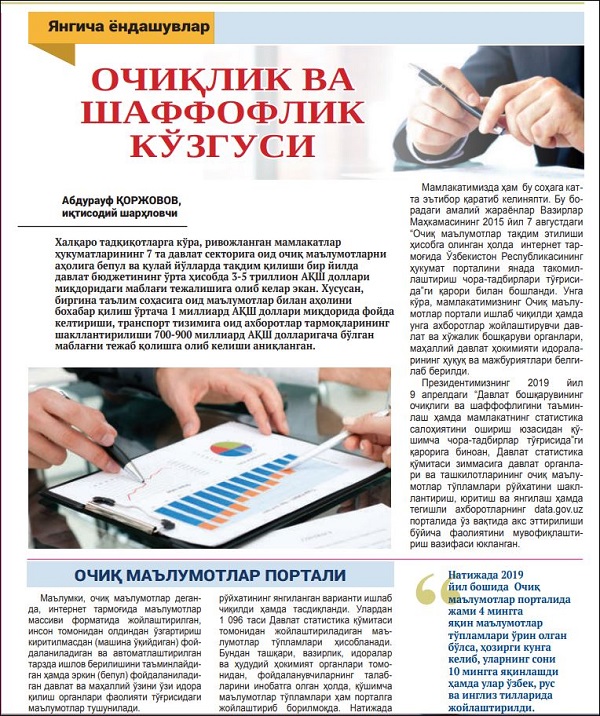 On October 28 this year, the newspaper “New Uzbekistan” published an article entitled “Mirror of Openness and Transparency.” In it, the head of the Department for Monitoring and Coordination of the Open Data Portal of the State Committee on Statistics, Akrom Sultanov, expressed his opinion on the transparency and openness of information.