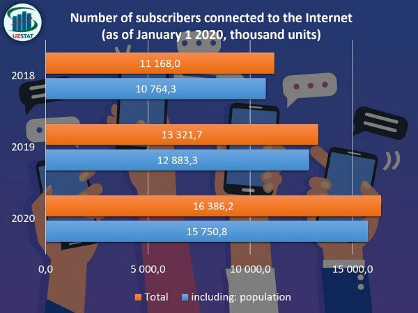 As of January 1, 2020, the number of subscribers connected to the Internet amounted to 16 386,2 thousand. Compared to the corresponding period of 2019, this number increased by 23.0% or 3 064,5 thousand. In particular, there are 15 750,8 thousand subscribers among the population, which is 22.3% or 2 867,5 thousand higher than last year.
