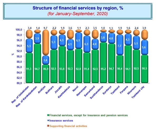 Among the regions, the share of financial services, except for insurance and pension services, was significant in Surkhandarya (95.2%), Syrdarya (94.7%) and Fergana (94.1%) regions.