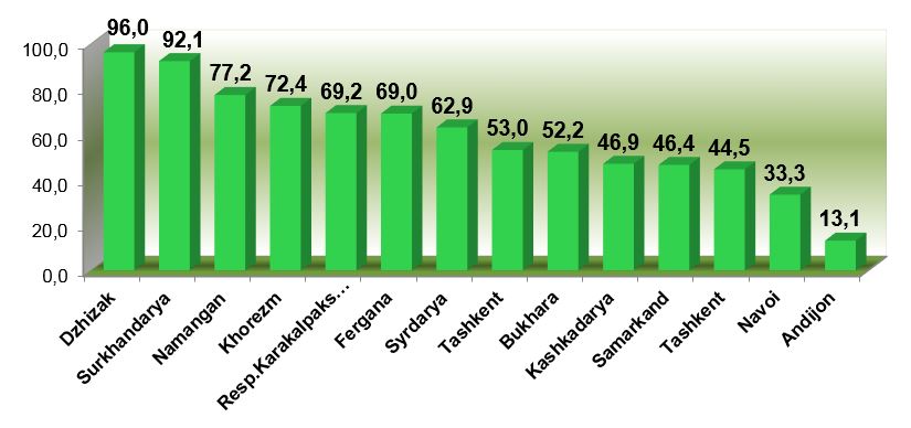 The share of imports of goods (works and services) of small businesses in the total volume of imports reached 51.4 %. By region, the highest rates were in Jizzakh (96.0 %), Surkhandarya (92.1 %), Namangan (77.2 %) and Khorezm (72.4 %) regions.