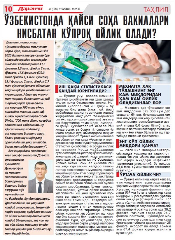 On November 12, 2020, the Darakchi newspaper published an article entitled “Representatives of which sphere in Uzbekistan receive more than a monthly salary?”. In this article, the head of the Department of Demography and Labor Statistics of the State Statistics Committee Zoir Yuldashev gave detailed information on the topic.
