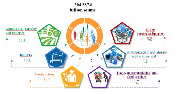 According to the results of 9 months of 2020, small businesses created value added in the amount of 204,287.6 billion soums. Small business created 54.2 % of the total value added in the economy. In the main sectors of the economy, this figure was: agriculture, forestry and fisheries – 98.2 %, construction – 75.9 %, services – 40.5% and industry – 23.1 %.