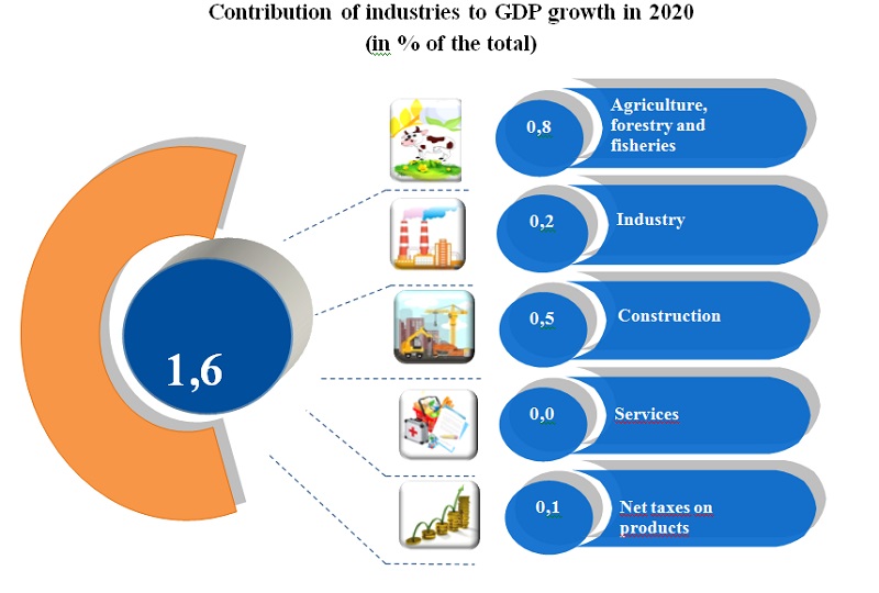 By the end of 2020 a positive contribution to GDP growth has made the industry of agriculture, forestry and fisheries – 0.8 percentage points (in 2019, 0.9%), industry - 0,2 p. p. (in 2019 to 1.2 p. p.) and construction – 0.5 PP (in 2019 to 1.2 p. p.).