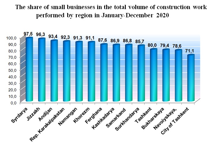 In January-December 2020, the share of small businesses in the total volume of construction work performed was 72.4 %. In the context of regions, the largest share was in the Syrdarya region 97.5 %, Jizzakh 96.3 %, and Andijan 93.4% regions.