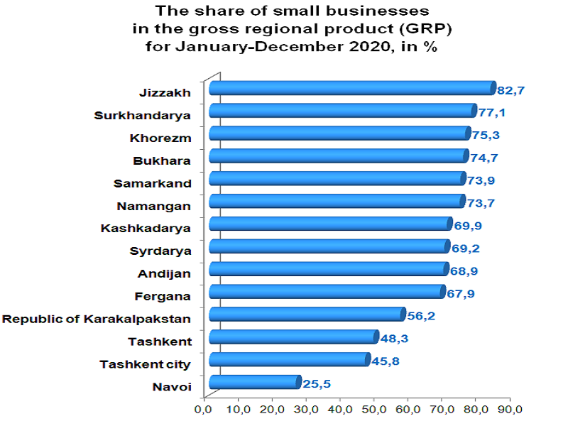 In the regional context, the largest share of small businesses in the GRP is accounted for in Jizzakh (82.7 %), Surkhandarya (77.1 %), Khorezm (75.3 %) and Bukhara