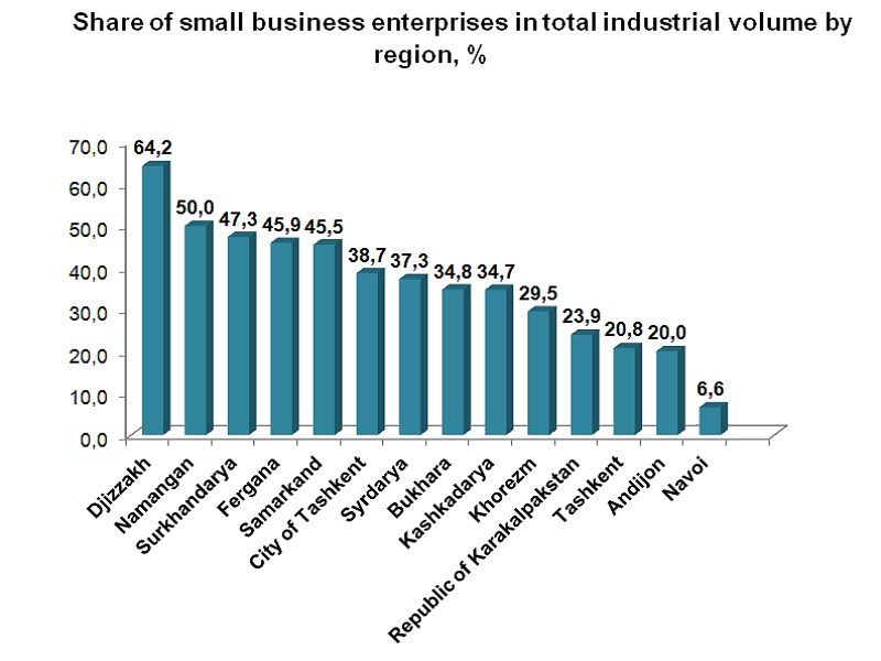 In the context of regions, the largest share of small businesses in the total volume of production was in the Jizzakh region – 64.2 %, Namangan – 50.0 %, Surkhandarya – 47.3 % and Ferghana –45.9 % regions.
