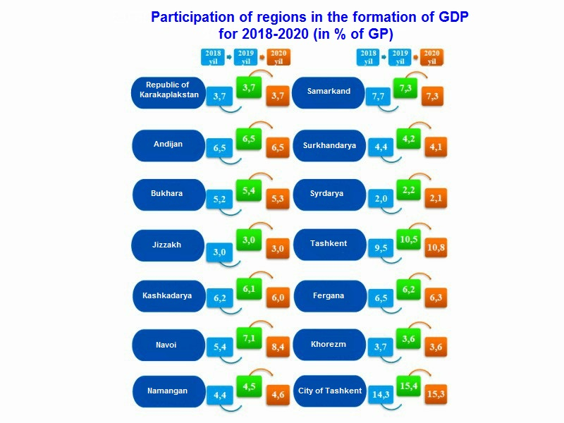 At the end of 2020, the largest contribution to the formation of the republic's GDP was made by the city of Tashkent with a specific weight of 15.3%. Tashkent and Navoi regions occupy the next places with indicators of 10.8% and 8.4%, respectively. Syrdarya (2.1%), Jizzakh (3.0%) and Khorezm (3.6%) regions and the Republic of Karakalpakstan (3.7%) have the smallest share in the formation of the republic's GDP.