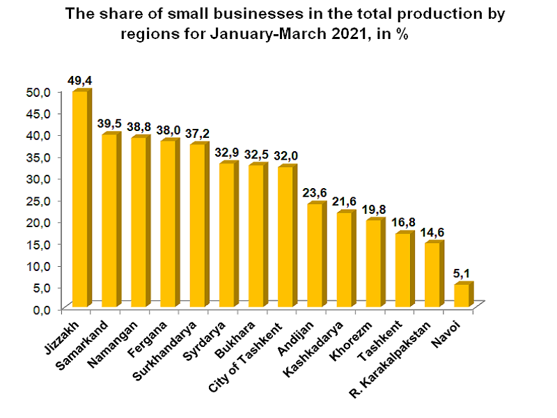 In the regional context, the largest share of small business in the total production volume was 49.4% in Jizzakh region, 39.5% in Samarkand, 38.8% in Namangan and 38.0% in Fergana regions.