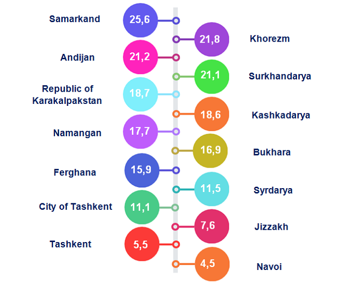 According to preliminary data for January-March 2021, the share of money transfers from abroad in the total total income of the population was 15.6%. By region, the largest share was observed in Samarkand (25.6%) and Khorezm (21.8%) regions. Also in Andijan (21.2%), Surkhandarya (21.1%) regions and the Republic of Karakalpakstan (18.7%), as well as Kashkadarya (18.6%), Namangan (17.7%), Bukhara(16.9%) and Ferghana (15.9%) regions.