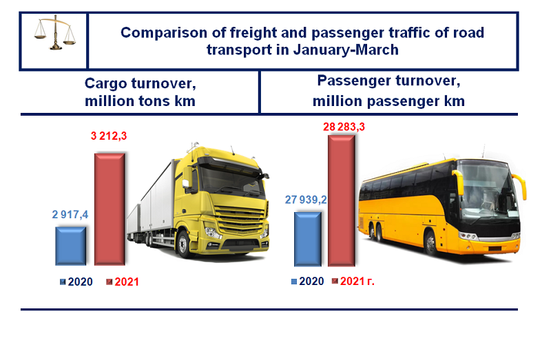 Road transport also plays a significant role in the transportation of goods and passengers. In January-March 2021, the volume of cargo turnover increased by 294.9 million t. km. and amounted to 3,212. 3 million t. km. or more by 10.1 % than in the same period in 2020.