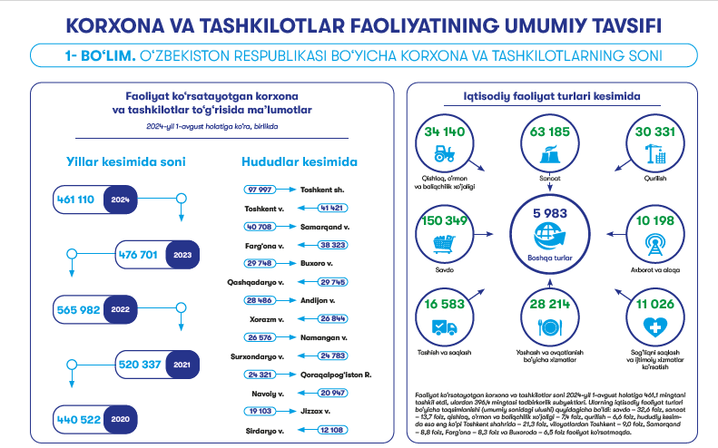 The 65th issue of the “Biznes Daily Birja” newspaper dated August 20, 2024 presents data on operating enterprises and organizations based on information from the Statistics Agency under the President of the Republic of Uzbekistan.