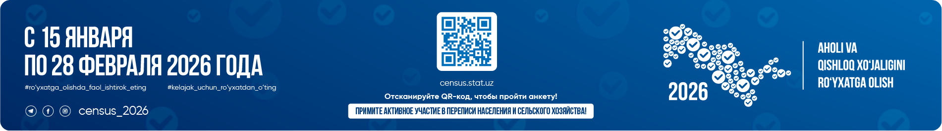 Перепись населения и сельского хозяйства Республики Узбекистан проводится с 15 января по 28 февраля 2026 года, данные переписи собираются по состоянию на 15 января 2026 года.