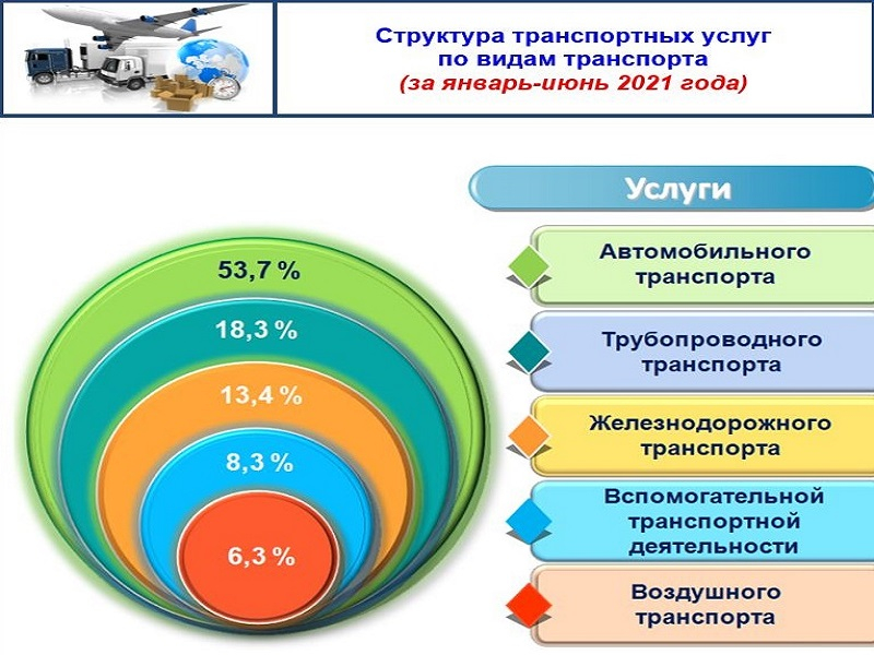 Доля услуг автомобильного транспорта составила 53,7%, трубопроводного транспорта - 18,3%, железнодорожного транспорта - 13,4%, вспомогательного транспорта - 8,3% и услуг воздушного транспорта - 6,3%.