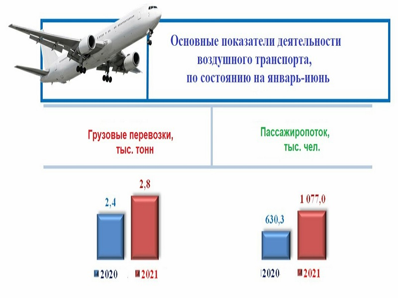 По итогам января–июня 2021 года по сравнению с соответствующим периодом прошлого года количество пассажиров, перевезенных воздушным транспортом, увеличилось на 70,9 процента и составило 1 077,0 тыс. человек.