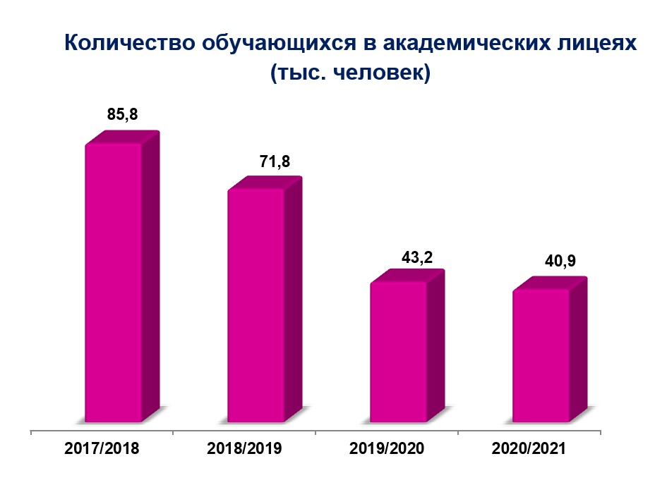 По данным Госкомстата, на начало 2020/2021 учебного года общее количество обучающихся в академических лицеях составило 40,9 тыс. человек, по сравнению с 2017/2018 учебным годом (2017/2018 учебный год – 85,8 тыс. человек) наблюдается снижение численности учащихся на 44,4 тыс. человек.