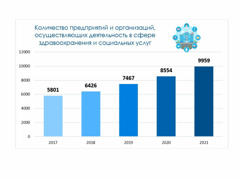 По данным Госкомстата, по состоянию на 1 августа 2021 года доля предприятий и организаций, осуществляющих деятельность в сфере здравоохранения и социальных услуг, в общем количестве предприятий и организаций составила 1,9 процента (9 959 единиц).