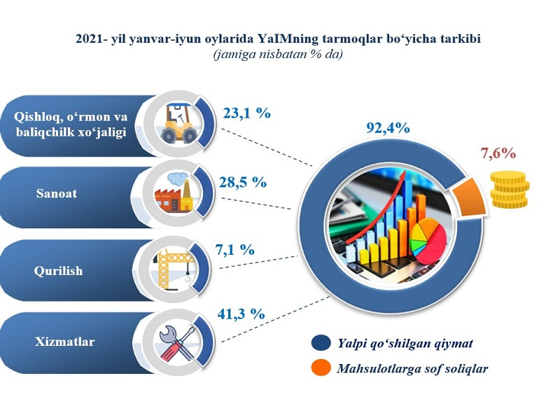 По итогам января-июня 2021 года валовой внутренний продукт (ВВП) Республики Узбекистан в текущих ценах составил 318,5 трлн. сум и, по сравнению с январем-июнем 2020 года, возрос в реальном выражении на 6,2 %.