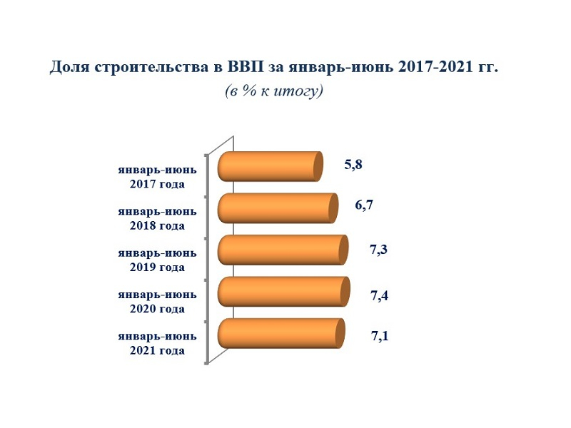 По итогам января-июня 2021 года доля строительства в ВВП Республики Узбекистан составила 7,1 % против 7,4 % в январе-июне 2020 года.
