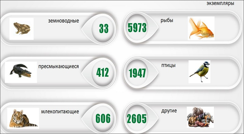 В Узбекистане действуют 3 зоопарка: в Ферганской, Сурхандарьинской областях и г.Ташкенте. В них насчитываются: пресмыкающихся – 412, птиц – 1947, млекопитающих – 606, рыб – 5973, земноводных – 33 ед. и 2605 других животных.