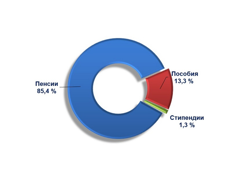 По предварительным данным за январь-июнь 2021 года в структуре социальных трансфертов доля пенсии равна 85,4 %, пособия – 13,3 % и стипендии – 1,3 %.
