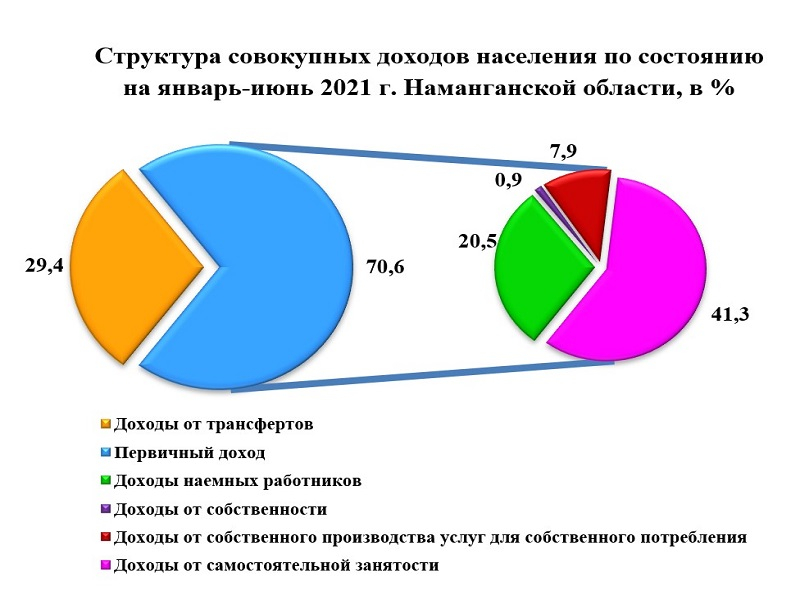 В Наманганской области наибольшая часть совокупного дохода населения была сформирована за счет доходов от трудовой деятельности (61,8 % от общего объема совокупного дохода), включающих в себя доходы наемных работников (20,5 %) и доходы от самостоятельной занятости (41,3 %).