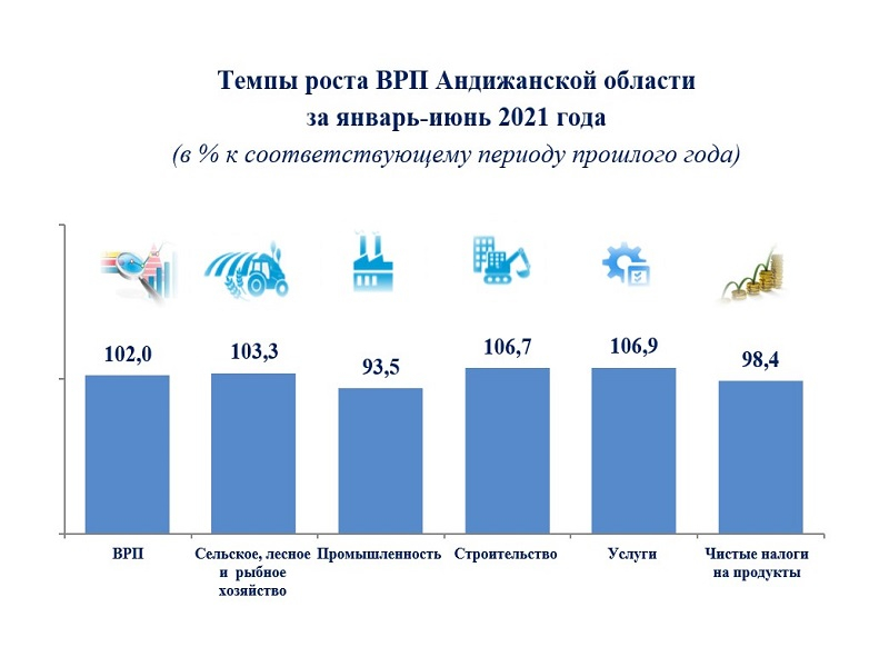 По итогам января-июня 2021 года ВРП Андижанской области возрос на 2,0 %. В структуре ВРП темпы роста сельского, лесного и рыбного хозяйства составили 103,3 %, строительства – 106,7 % и сферы услуг – 106,9 %. В промышленности отмечено снижение объема в сопоставимых ценах, который составил 93,5 % к уровню января-июня 2020 года.