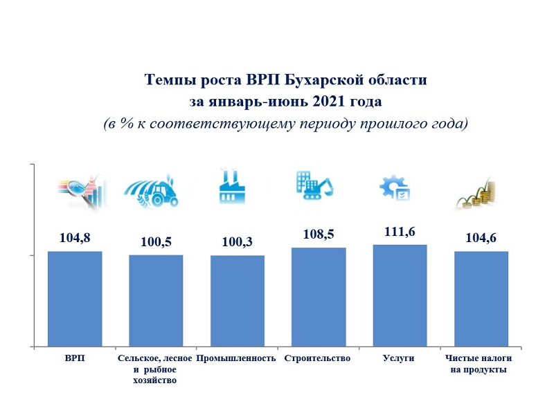 По итогам января-июня 2021 года ВРП Бухарской области возрос на 4,8 %. В структуре ВРП темпы роста сельского, лесного и рыбного хозяйства составили 100,5 %, промышленности – 100,3 %, строительства – 108,5 % и сферы услуг – 111,6 %.