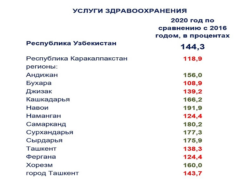 В 2020 году по Республике Узбекистан по сравнению с 2016 годом темп роста объема рыночных услуг в сфере здравоохранения составляет 144,3 процента.