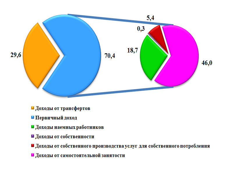 Удельный вес доходов от производства услуг для собственного потребления в общем объеме совокупного дохода населения составил 5,4 %, доходов от собственности – 0,3 % и доходов от трансфертов – 29,6 %.
