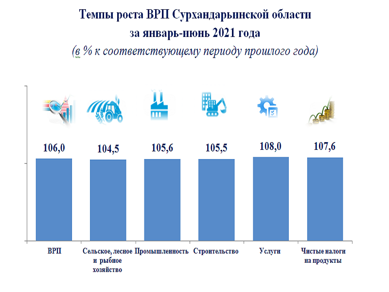 По итогам января-июня 2021 года ВРП Сурхандарьинской области возрос на 6,0 %. В структуре ВРП темпы роста сельского, лесного и рыбного хозяйства составили 104,5 %, промышленности – 105,6 %, строительства – 105,5 % и сферы услуг – 108,0 %.