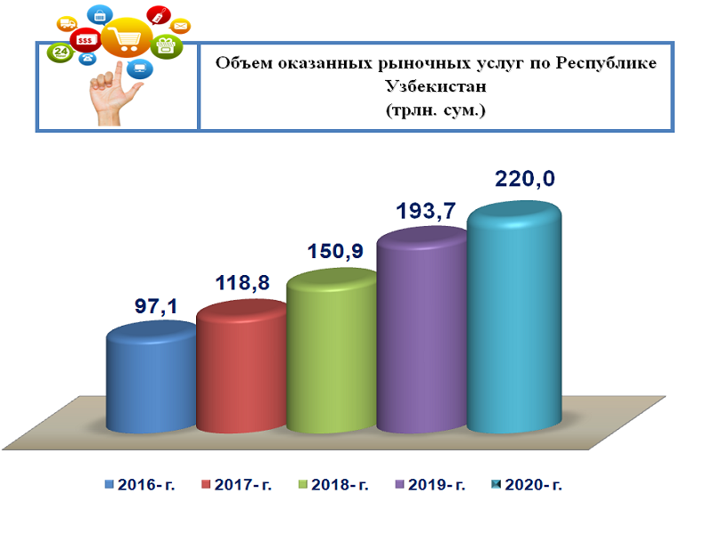 За последние годы по Республике Узбекистан наблюдался резкий рост объемов оказываемых рыночных услуг. Если в 2016 году общий объем оказанных рыночных услуг составил 97,1 трлн. сумов, то в 2020 году этот показатель составил 220,0 трлн. сумов.