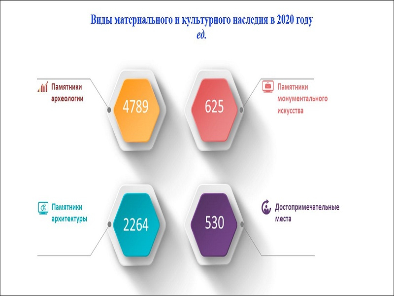 В 2020 году общее количество памятников археологии составило 4789, памятников архитектуры – 2264, памятников монументального искусства – 625, достопримечательных мест – 530.