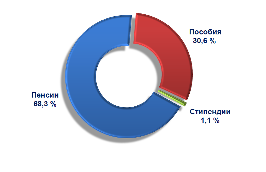 По предварительным данным за январь-июнь 2021 года в структуре социальных трансфертов доля пенсии равна 68,3 %, пособия – 30,6 % и стипендии – 1,1 %.