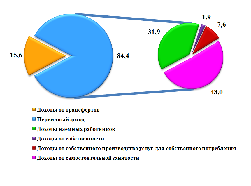 Удельный вес доходов от производства услуг для собственного потребления в общем объеме совокупного дохода населения составил 7,6 %, доходов от собственности – 1,9 % и доходов от трансфертов – 15,6 %.