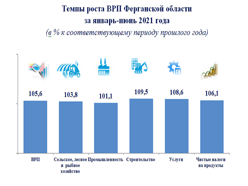 По итогам января-июня 2021 года ВРП Ферганской области возрос на 5,6 %. В структуре ВРП темпы роста сельского, лесного и рыбного хозяйства составили 103,8 %, промышленности – 101,1 %, строительства – 109,5 % и сферы услуг – 108,6 %.